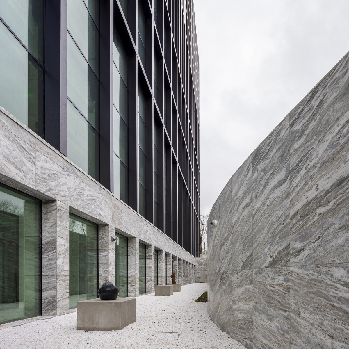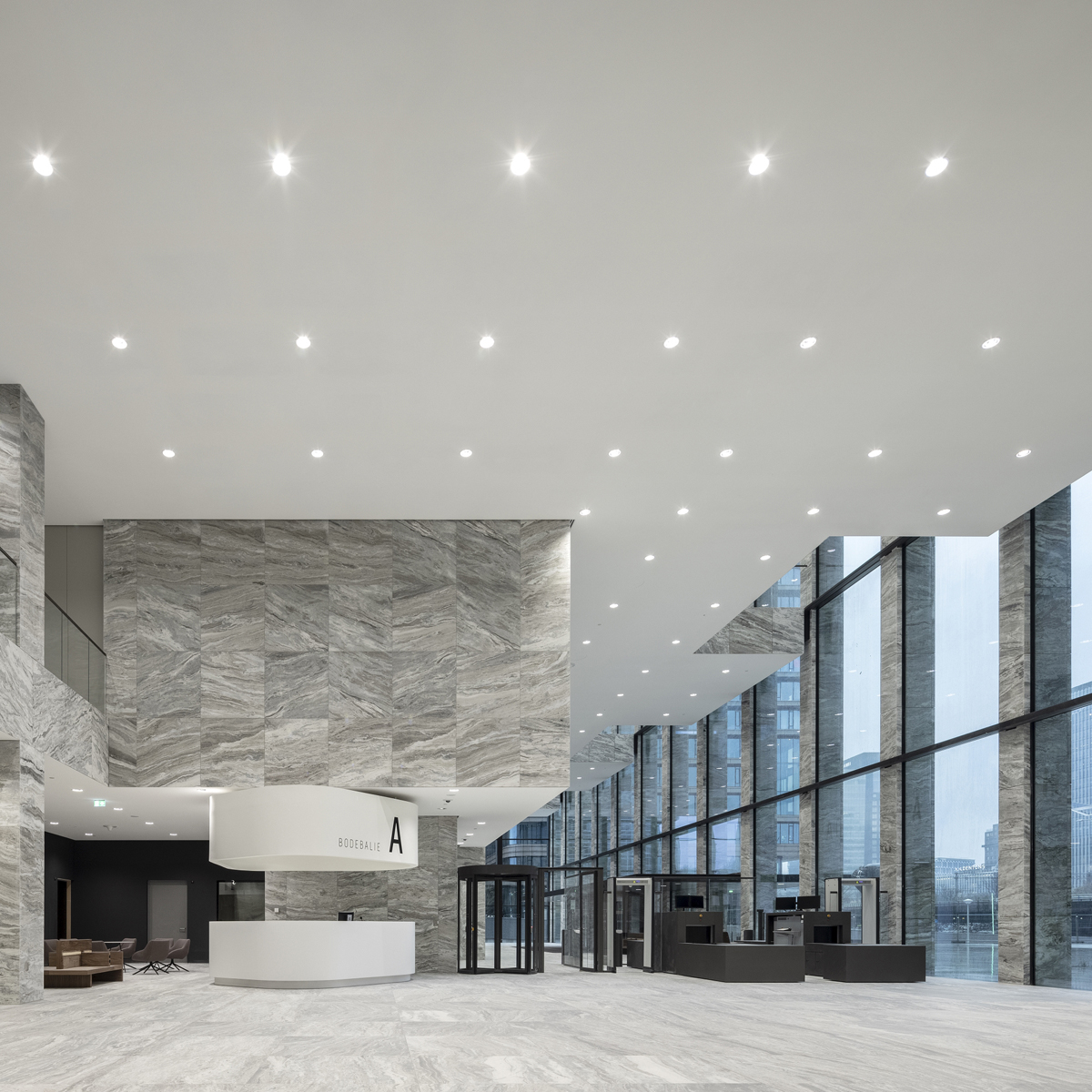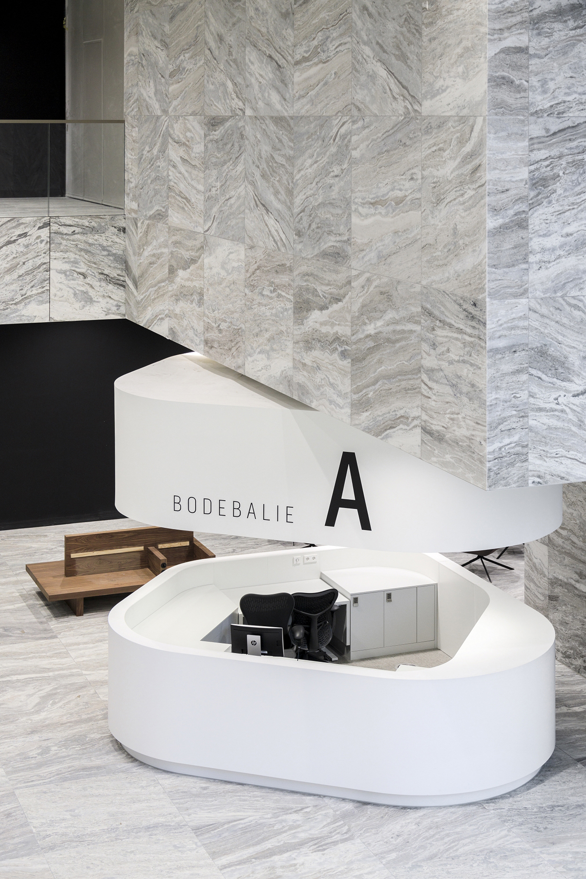 Where the building and city merge, the entrance is furnished with a south-facing square the size of half a football pitch. This square in fact takes up a quarter of the courthouse site, features the same light grey paving as indoors, and has the same benches. The elegant canopy over the entrance stretches an equal distance into the indoor space, uniting the two. The square is public space, of course, and makes a gesture to the city. A low-rising ramp minimizes any sense of obstruction between the city, the square, and the courthouse, even though the structure is slightly raised for security (against collisions). One side of the square has been planted with trees that blossom, giving not only staff and courthouse visitors a place to relax, but everyone in the area at any time of day.