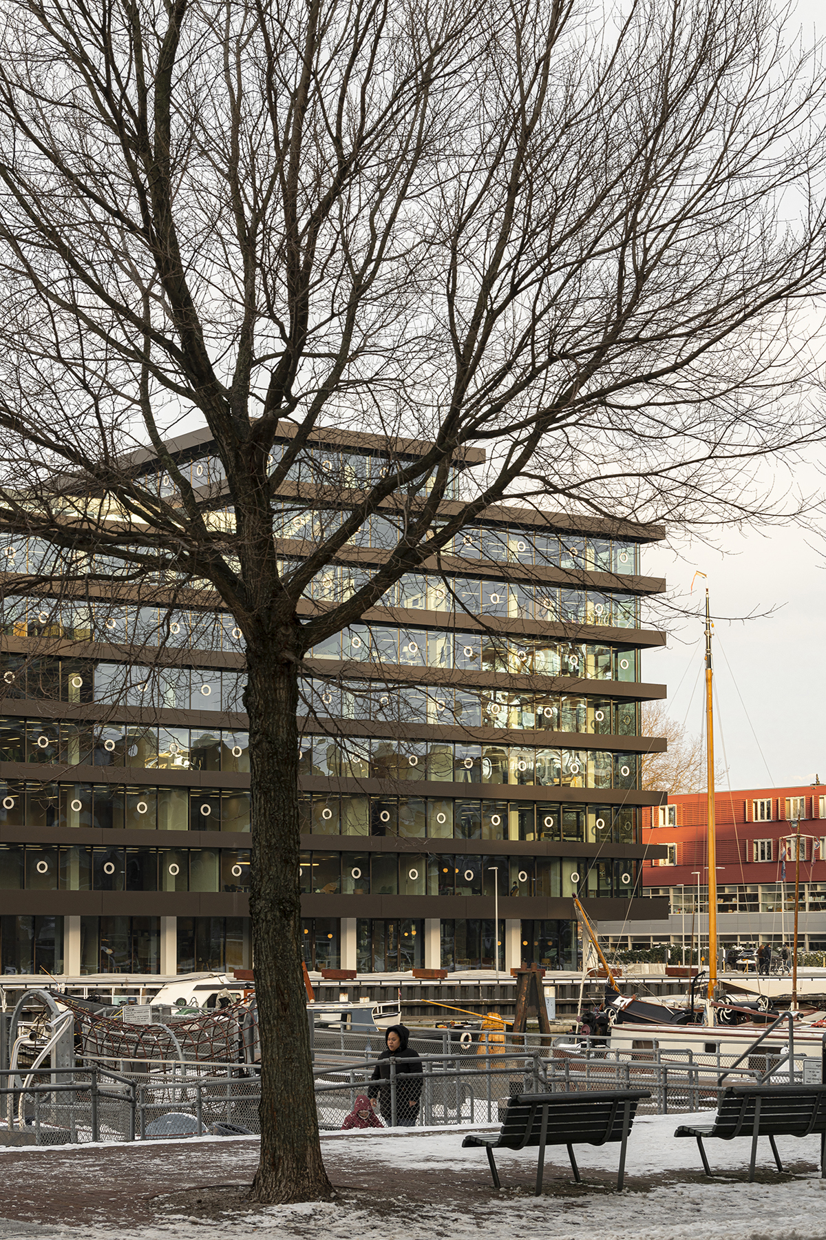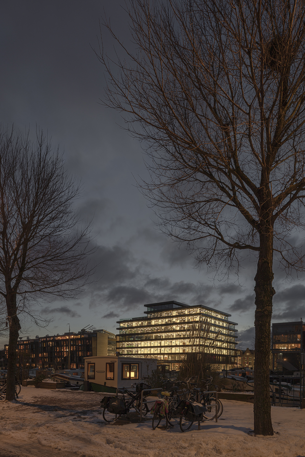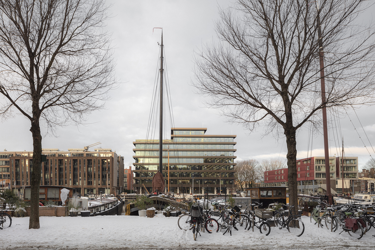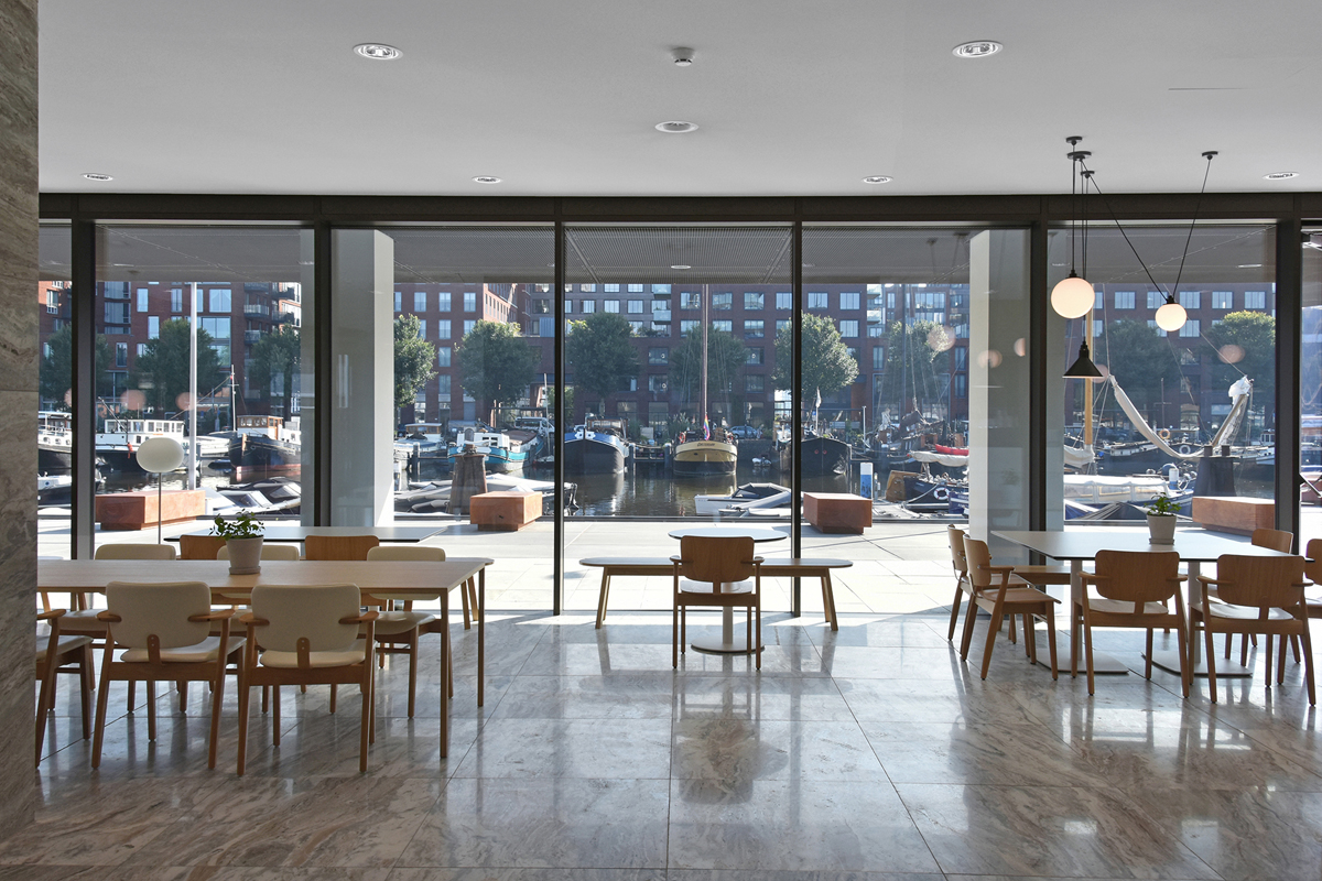 De Walvis is still a prominent building in its surroundings, though the high-density housing on the other side of Westerdok puts this into perspective. KAAN Architecten has introduced clear lines into the building: with the load-bearing columns mostly hidden within the envelope, the protruding floors are its most expressive facet. This horizontality is the soul of the structure.