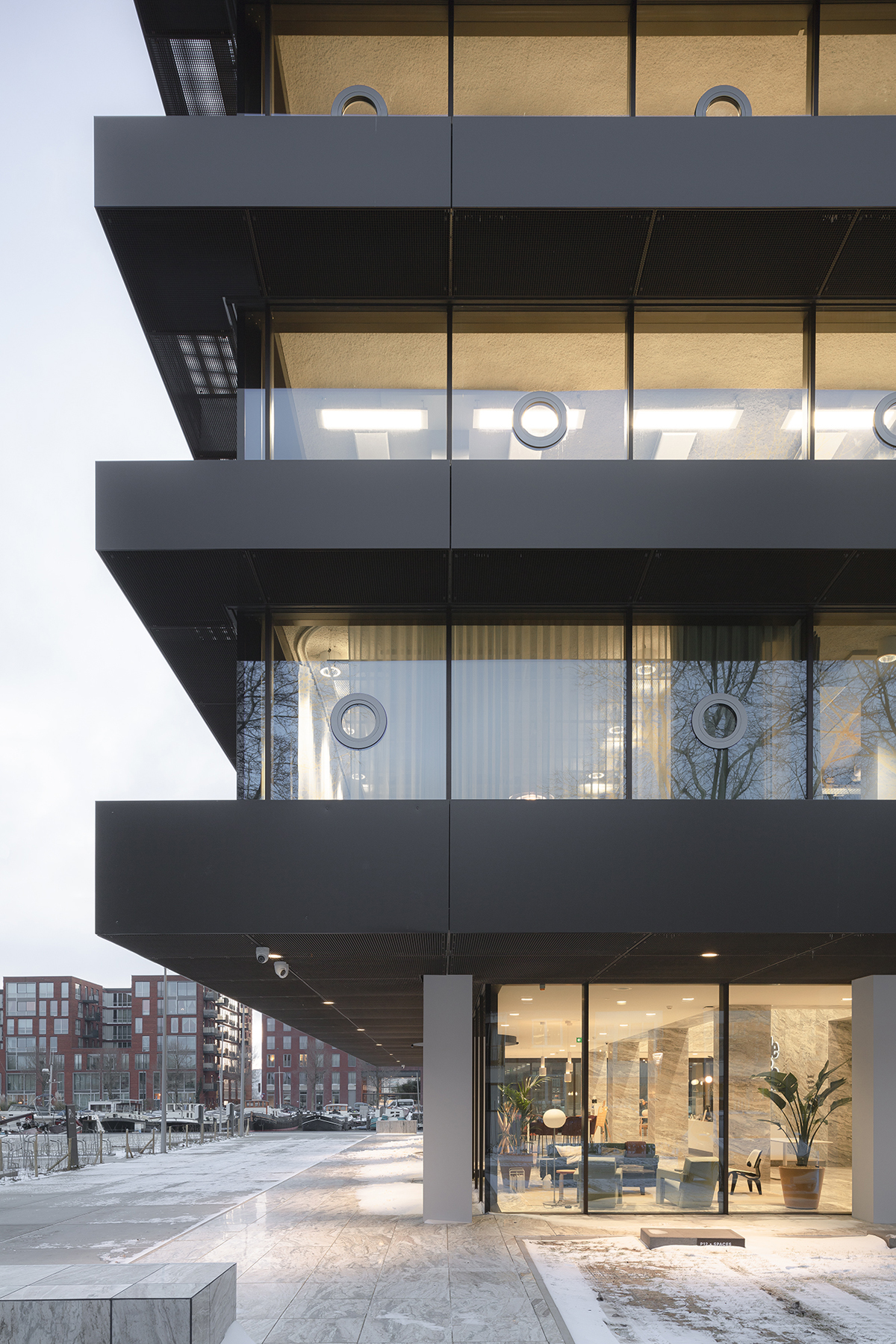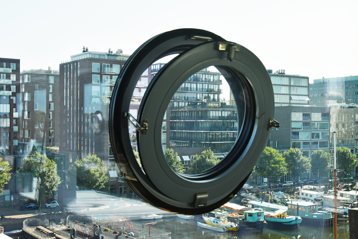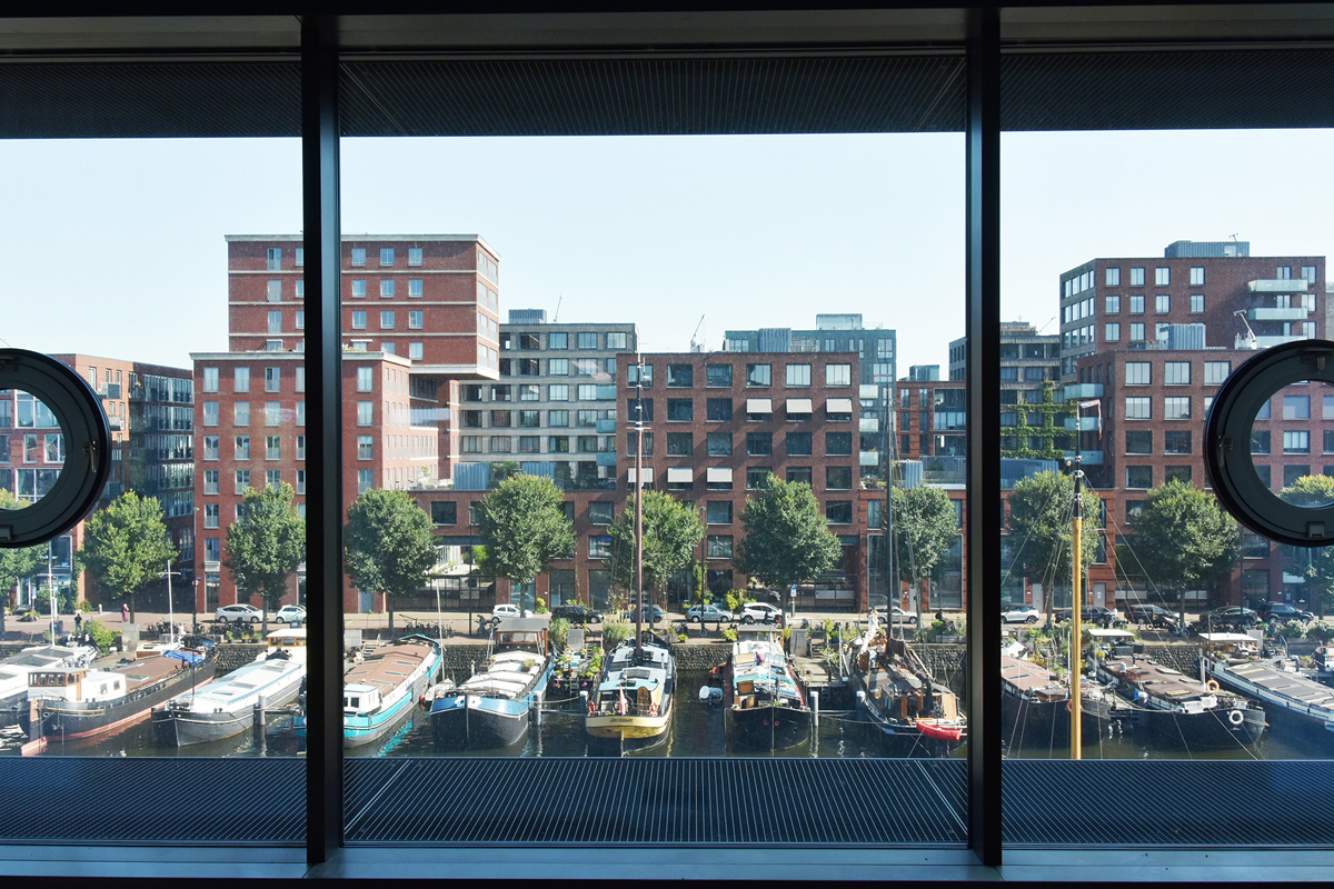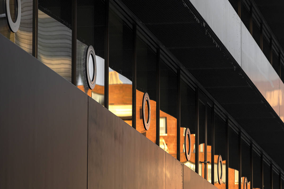 Recessed bands of triple glazing further optimise the effect of ‘floating’ floors on each storey – the windows seem to go from floor to ceiling and have almost invisible vertical rebates. To avoid a sense of fragility, portholes have been incorporated into the glazing in a tight rhythm, at eye-level per floor, and all easily opened. These round pivot windows could be seen as a reference to the area’s maritime history, though they also recall the pivot windows of the old building.