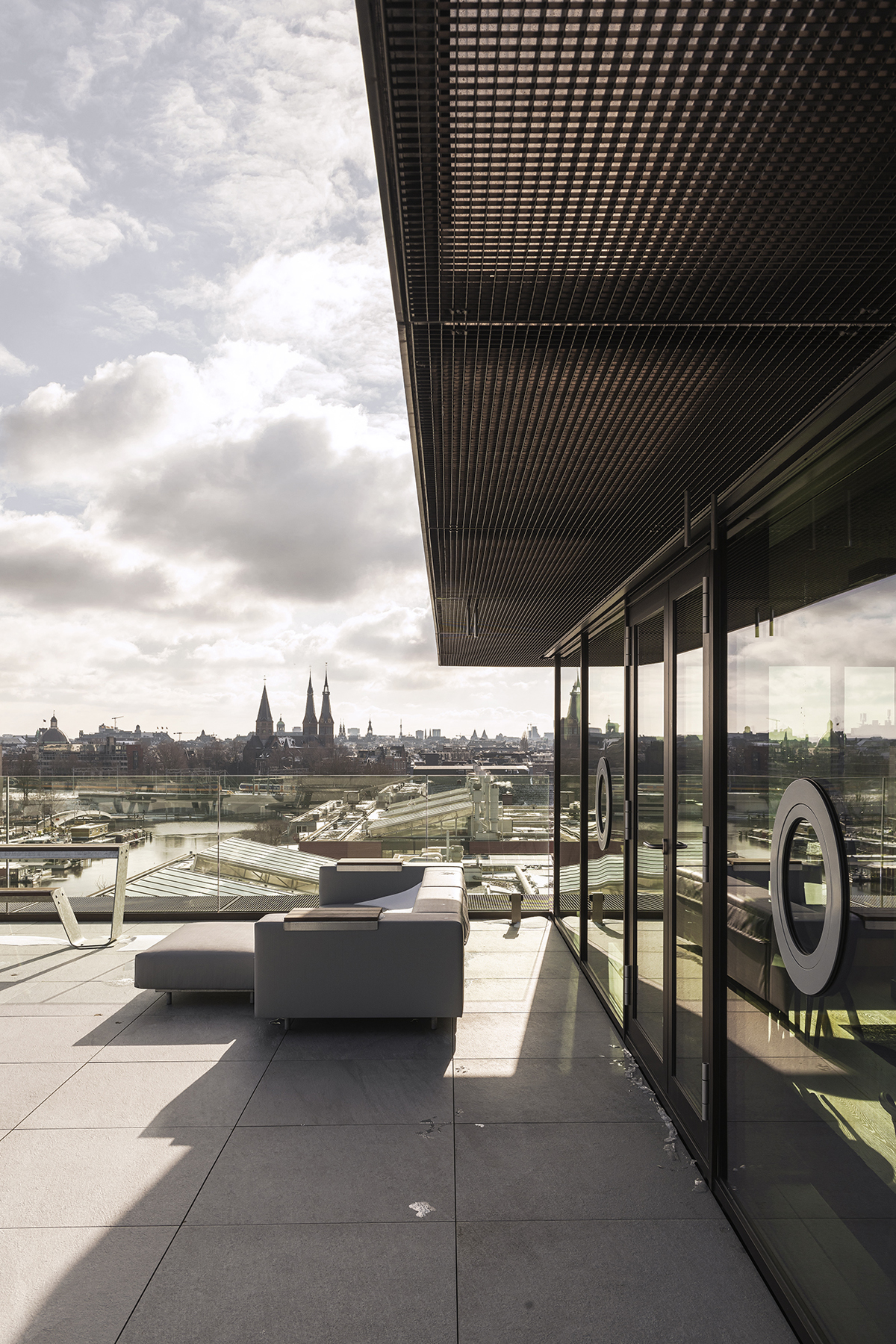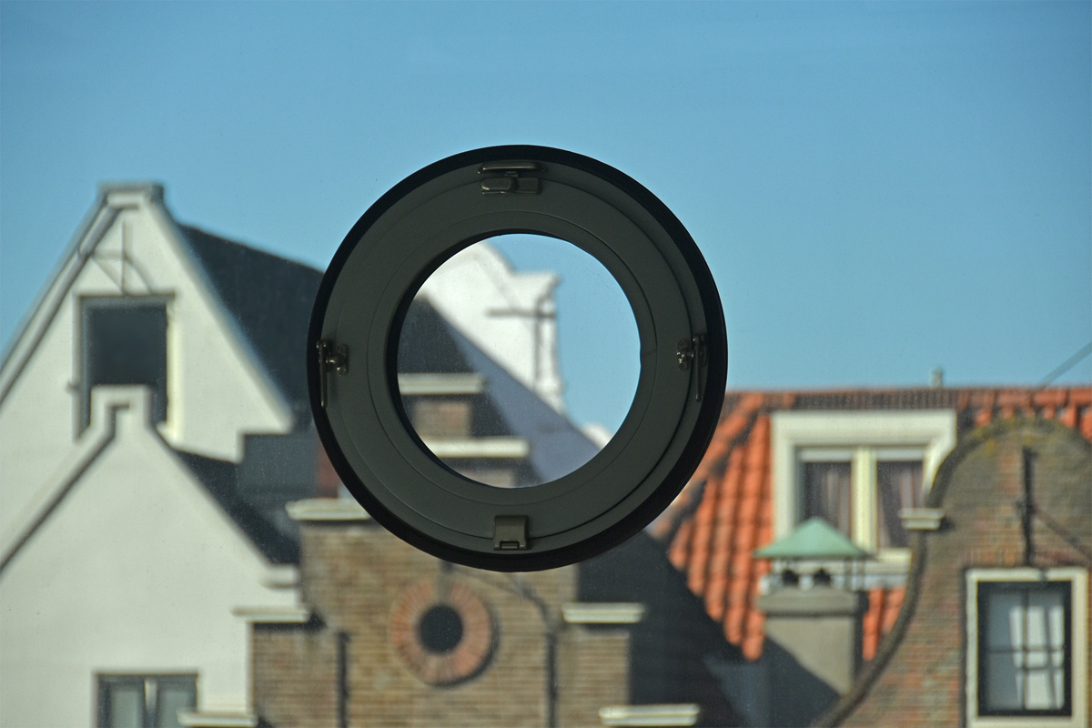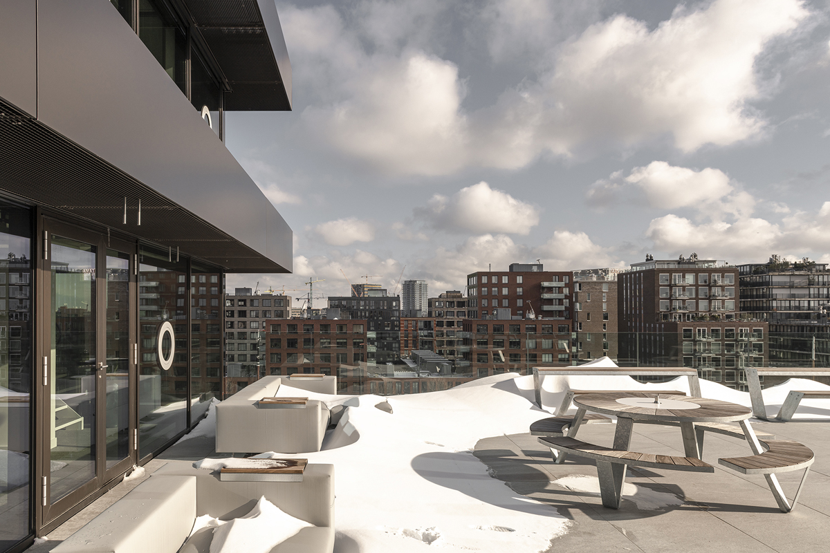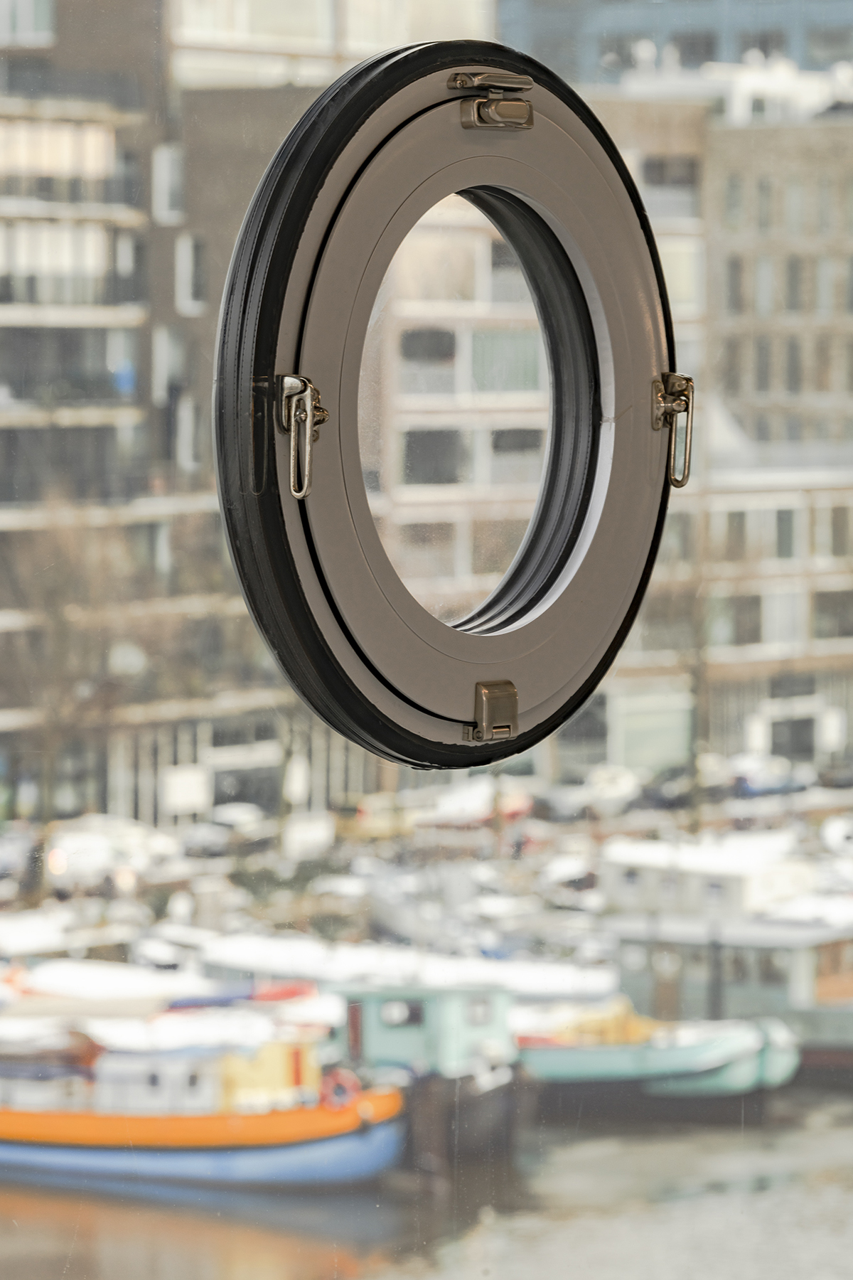 Recessed bands of triple glazing further optimise the effect of ‘floating’ floors on each storey – the windows seem to go from floor to ceiling and have almost invisible vertical rebates. To avoid a sense of fragility, portholes have been incorporated into the glazing in a tight rhythm, at eye-level per floor, and all easily opened. These round pivot windows could be seen as a reference to the area’s maritime history, though they also recall the pivot windows of the old building.