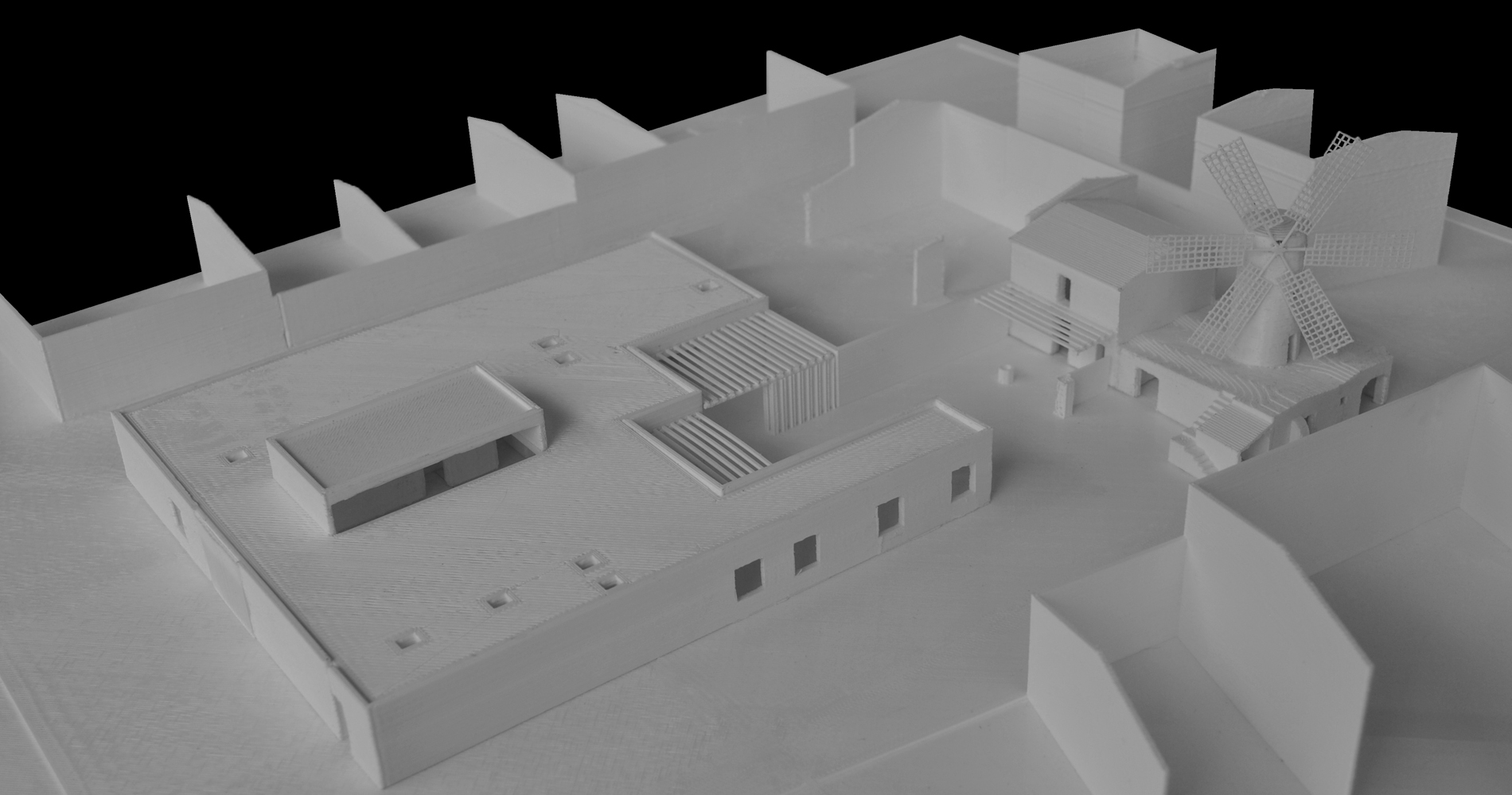 El punt de partida del projecte són els murs de càrrega que formen les cases de Vilafranca. Aquests murs signifiquen el punt d’unió entre el poble existent de Vilafranca i el projecte que es vol construir. S’escull la pedra autòctona de Mallorca com a material per formar aquests murs, el marès, el qual constituirà tant l’estructura com l’acabat. Amb només un material i quatre tipus de peça s’aconsegueix donar forma a tot el projecte.