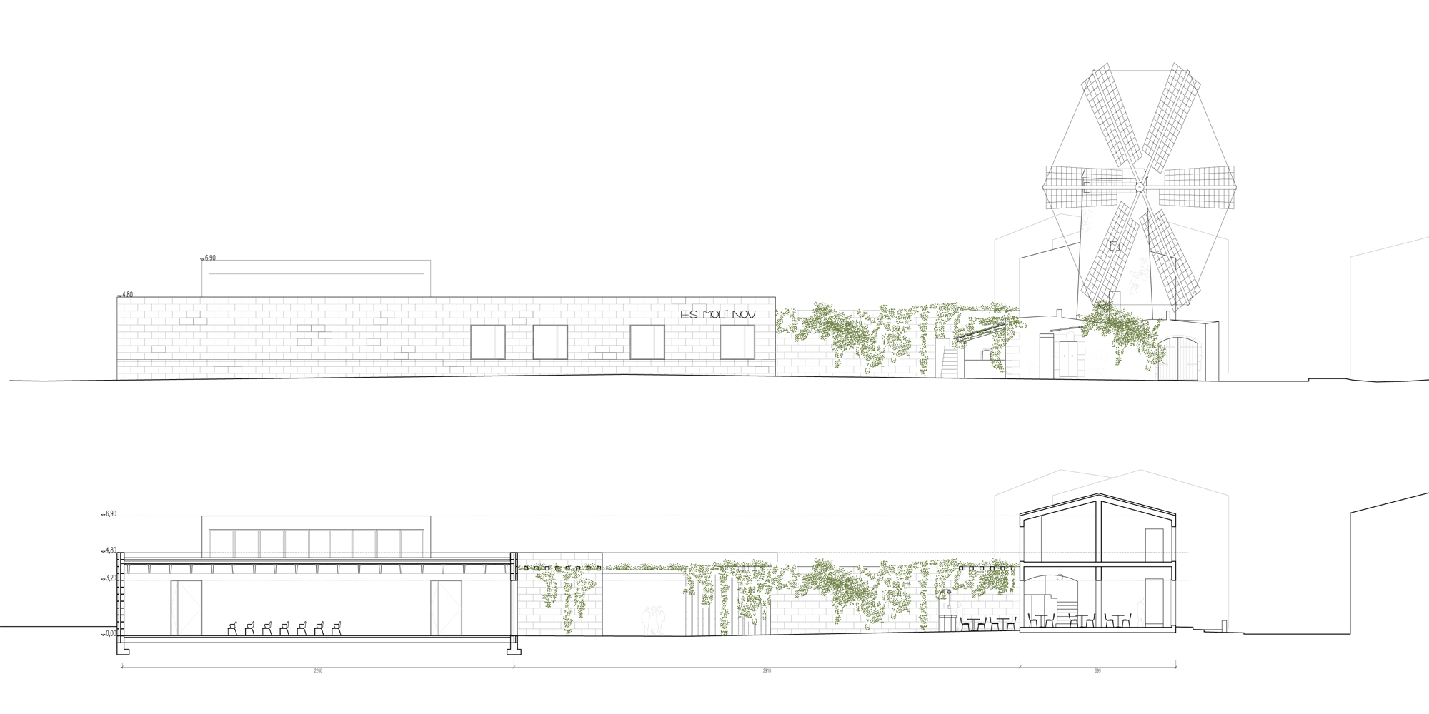 Aquests murs són contenidors d’activitat: contenen les instal·lacions, les llibreries, els serveis… I formen les dependències del Centre: una biblioteca, una sala polivalent, una administració i uns despatxos que formen el Viver d’Emprenedors. El Molí Nou dóna cabuda al Museu Etnològic del Pla de Mallorca i la casa del Molí Nou ho fa a una cafeteria i una sèrie d’aules-taller.