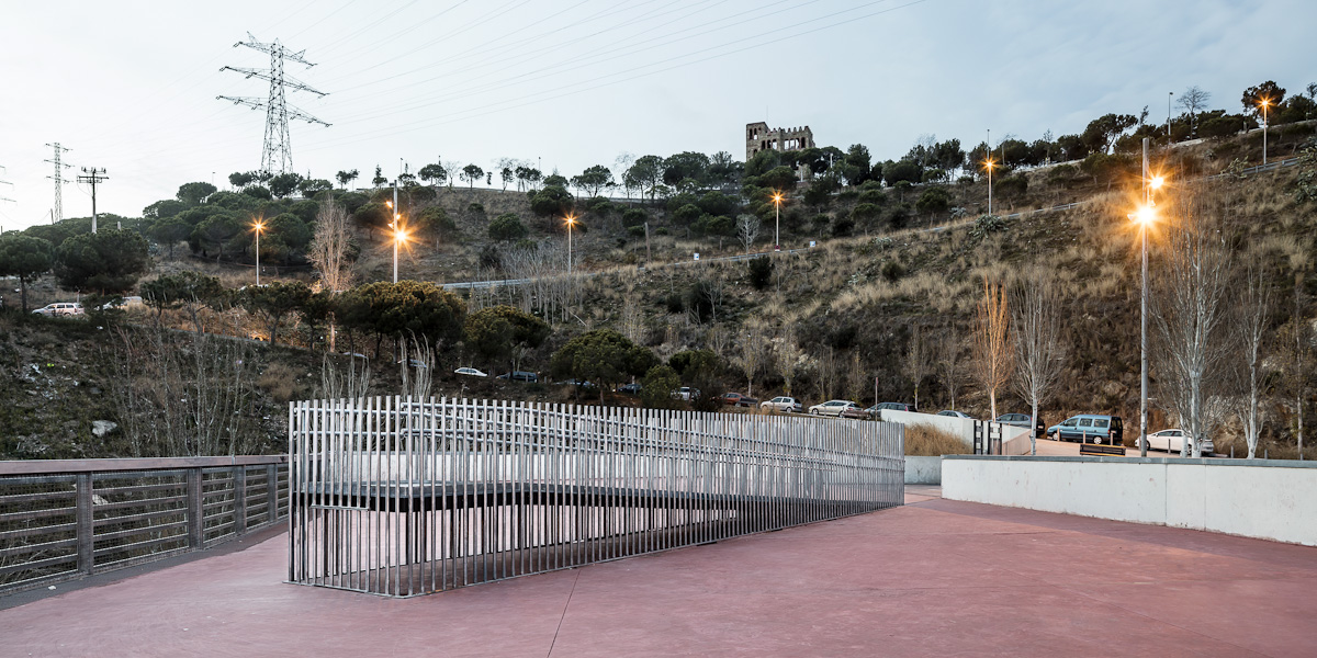 Huyendo de la concepción referencial clásica del objeto para ser visto e independiente de su entorno, se ha buscado una intervención multi-escalar, trabajando en complicidad con el territorio. La obra plantea una línea de referencia. Una traza mesurable que puede ser experimentada para acercarnos a aquello inmensurable, en este caso, la ciudad de Barcelona. La línea dibujada deja de ser la protagonista de la obra para dar paso al verdadero protagonista, el entorno. Desde este punto de vista, la intervención funciona como una continuidad de la sección del barrio dónde se emplaza, la prolongación de una calle en pendiente que, sutilmente, se separa para contemplar la ciudad.