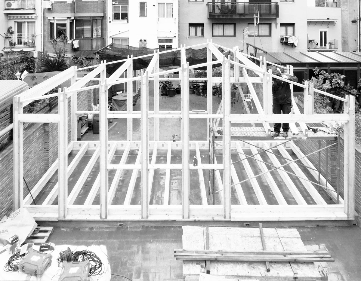 Se trata de la construcción de un pabellón en una terraza para complementar los usos de un pequeño apartamento. Una segunda sala y una habitación-estudio.