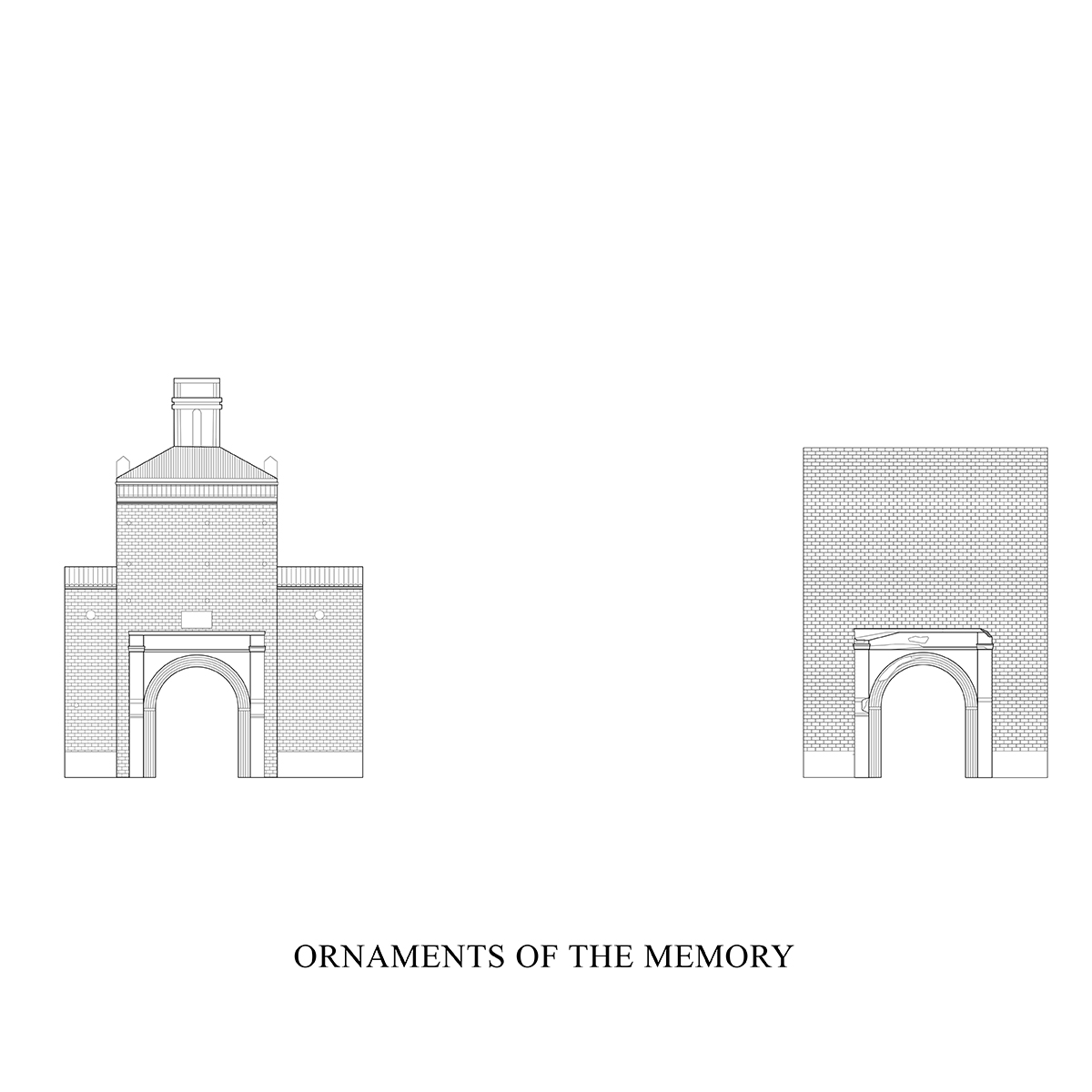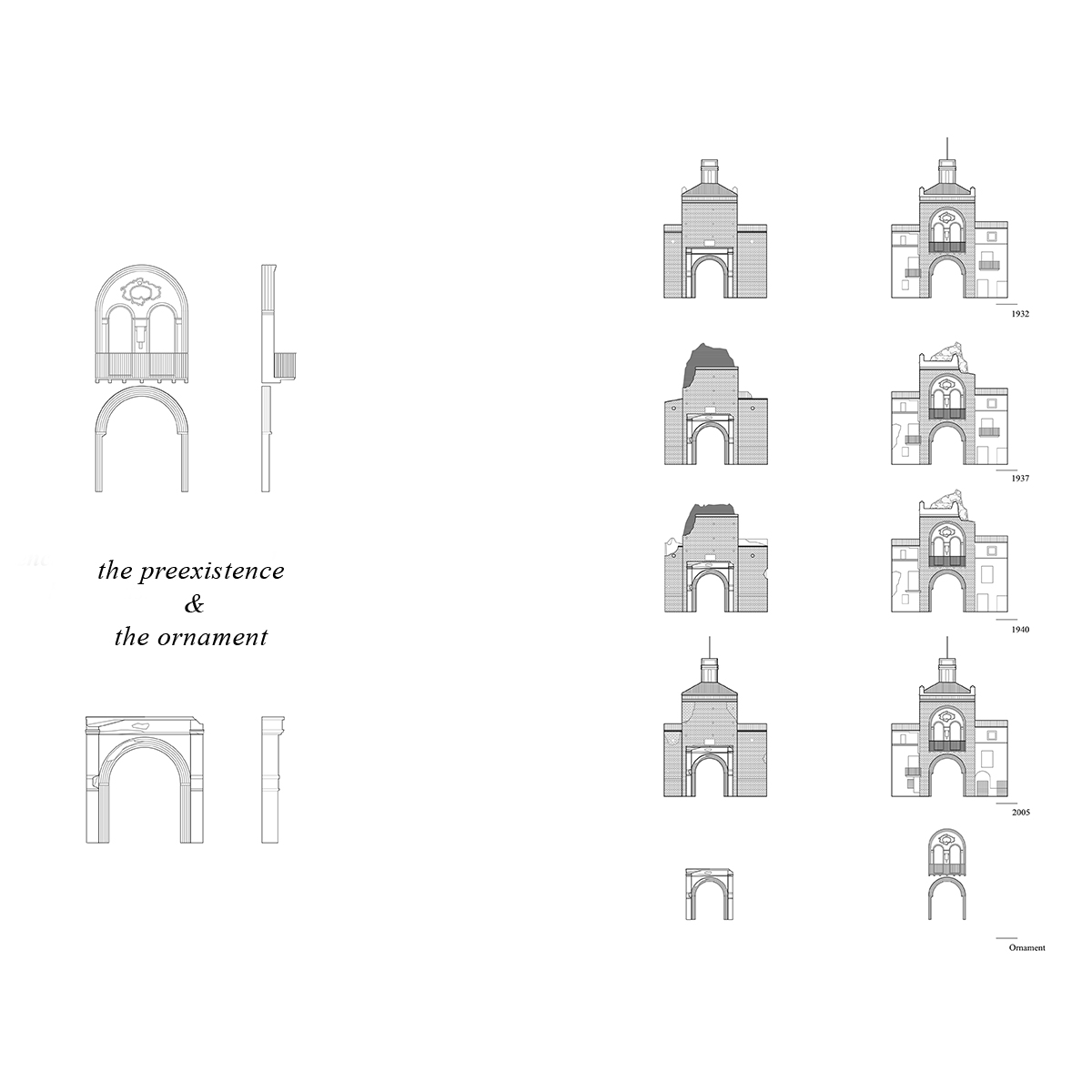 The ornament is the only remanescence part of the building after Civil War. The hall will include this element, remembering the memory of the place in the exterior and the interior. On the main façade, there is the ornament of the entrance. On the posterior façade. there is the ornament of the window and the one of the entrance too.