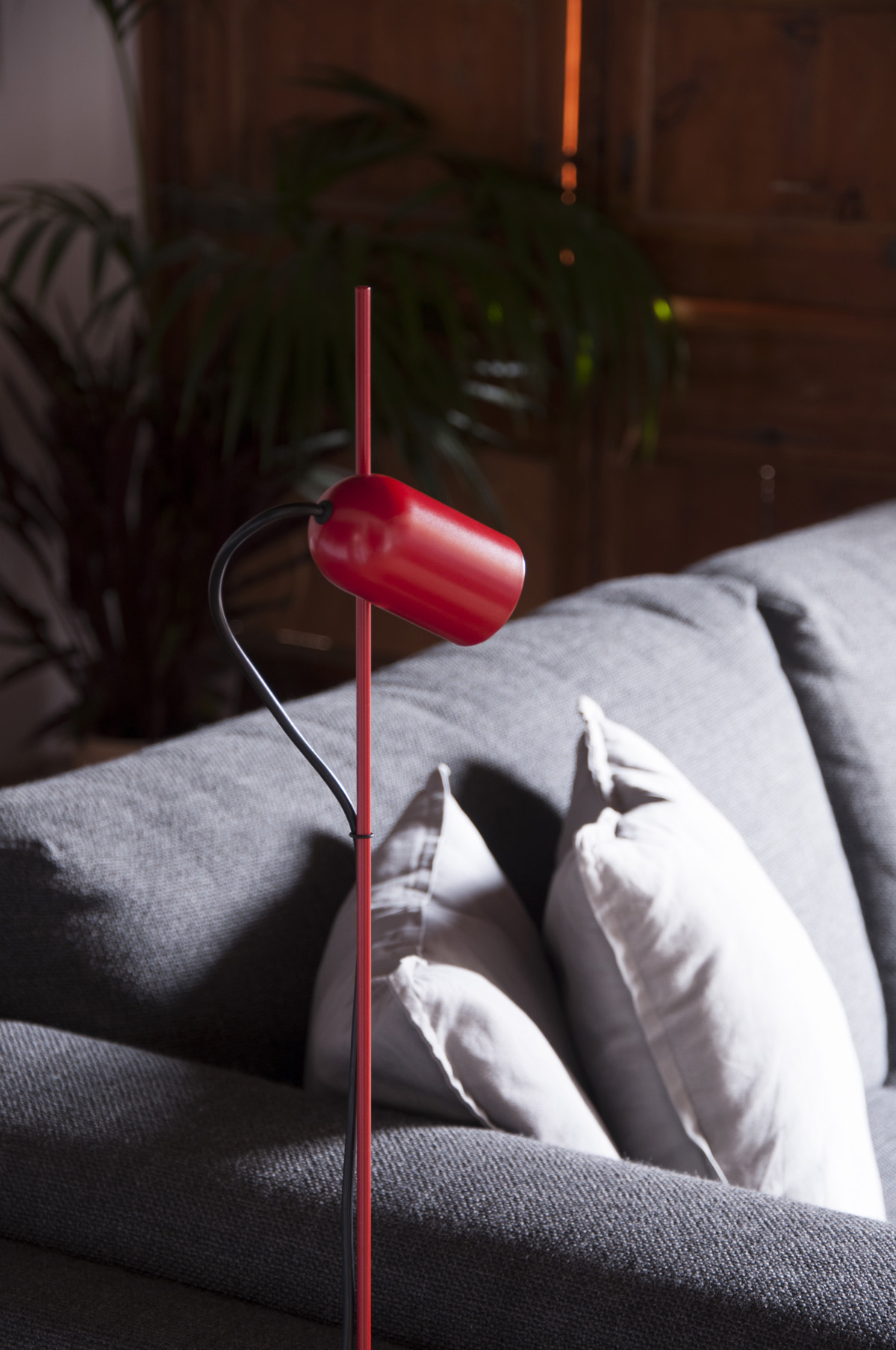 La luminaria resultante es sorprendentemente sencilla en su concepción: una base de acero macizo, una barra del mismo material, un foco, un imán y un anillo de goma. El producto, realizado en dos medidas distintas, consiguió iluminar las decenas de cuadros desde numerosas posiciones y pasando casi desapercibido.