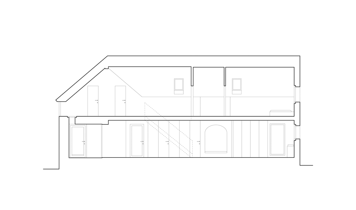 We respect the basic shape, scale, and materiality of the original masses. We adjust the internal disposition in an effort to make the building accessible from two sides – for pedestrians from the square and for cars from the opposite side. The large window in the gable of the courtyard facade is an answer to the unique view of the church tower. Views from the interior of the courtyards enrich the overall perception of the space. We intentionally leave the newly created openings minimalistic to create a contrast with the original traditionally divided windows.