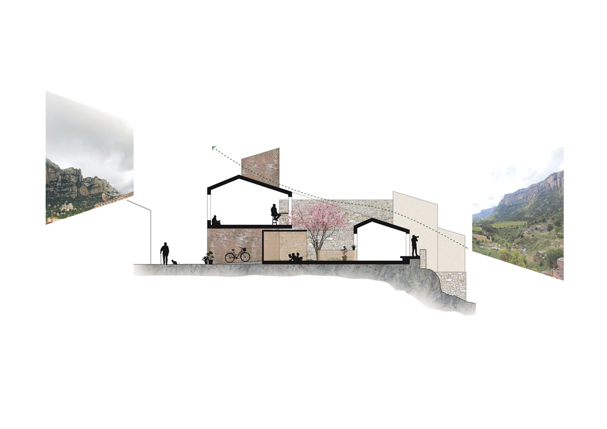 La parcela de esta casa entre medianeras es estrecha y profunda. Su fachada oeste tiene unas maravillosas vistas sobre el Montsant, pero está expuesta al fuerte viento de la zona “el mestral”. La este es la que conecta con la vida del pueblo. Dentro resistía un viejo almendro que se quiso mantener y transformar en la parte central de la casa sobre la cual pivotan los espacios interiores habitables.