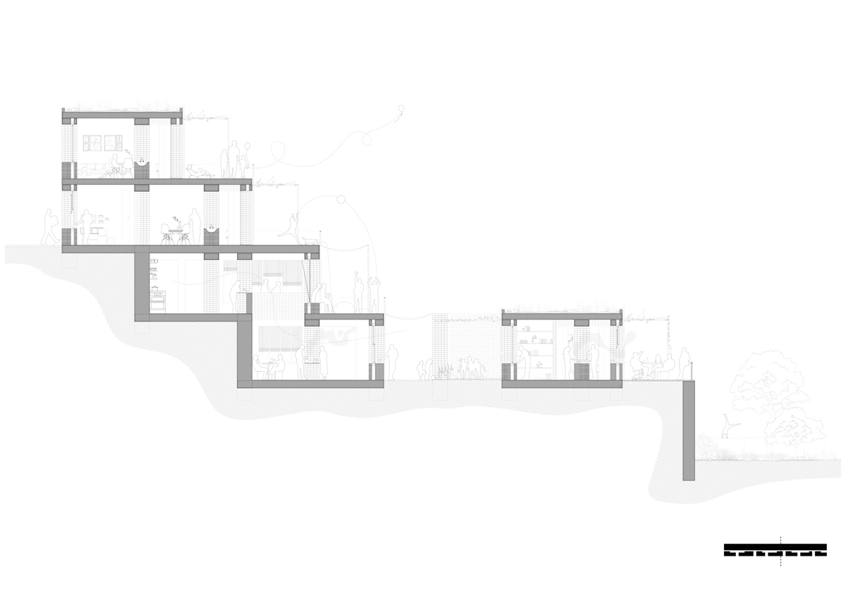 La sección en grada del emplazamiento es uno de los motivos generadores del proyecto. Que a partir de la agregación de niveles pretende suavizar el cambio de cota. Es así como el edificio se articula a través de cuatro niveles que se superponen de forma ascendente desde la cota de la parcela hasta la cota calle, llegando a ascender hasta los 13,20 metros de altura.