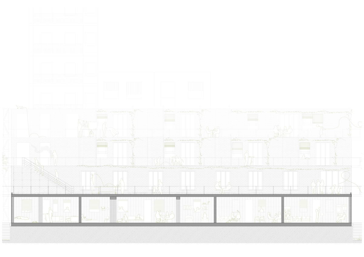 Acabada la relación entorno-edificio, el siguiente nivel de habitar reside en la forma de convivir, de compartir. El proyecto, como consecuencia de los cortes o separaciones que suponen los pasajes de relación, se desarrolla entorno a siete conjuntos de viviendas que, situadas en planta baja, segunda y tercera, comparten una serie de espacios compartidos situados en los dos primeros niveles.