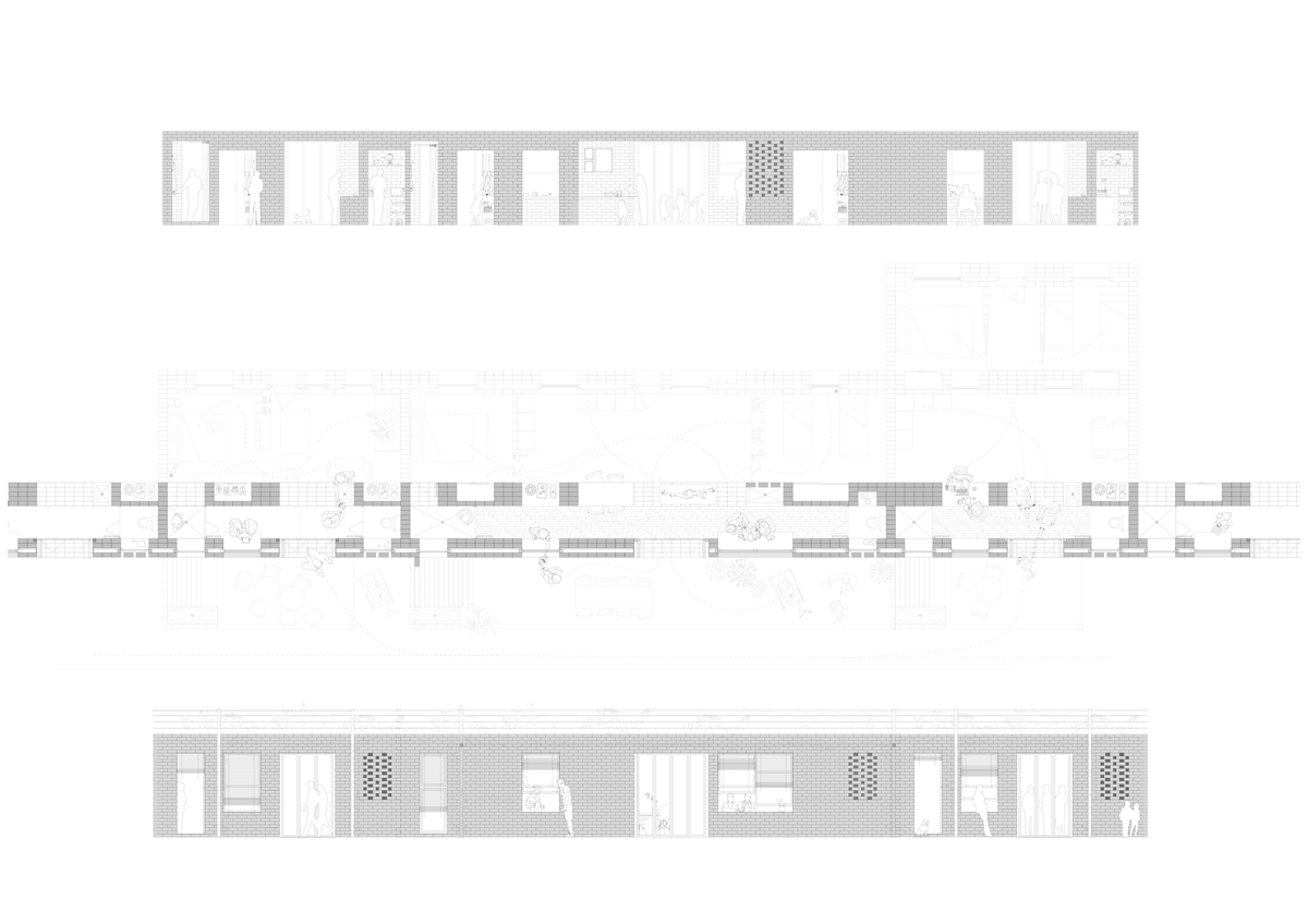 Igualmente, es importante esclarecer que estos seis patios no son núcleos aislados, sino que quedan conectados por un elemento de pasaje en planta baja. Este, no solo separa el ámbito público del privado, sino que sirve como nexo de unión entre patios y principal eje de recorrido en la dirección paralela al eje río.