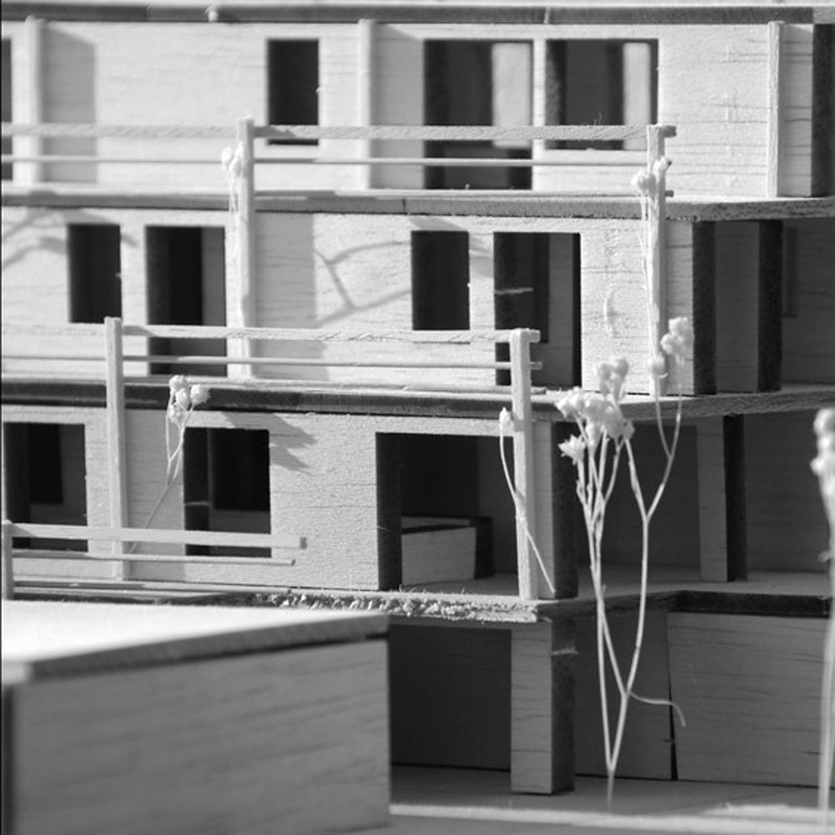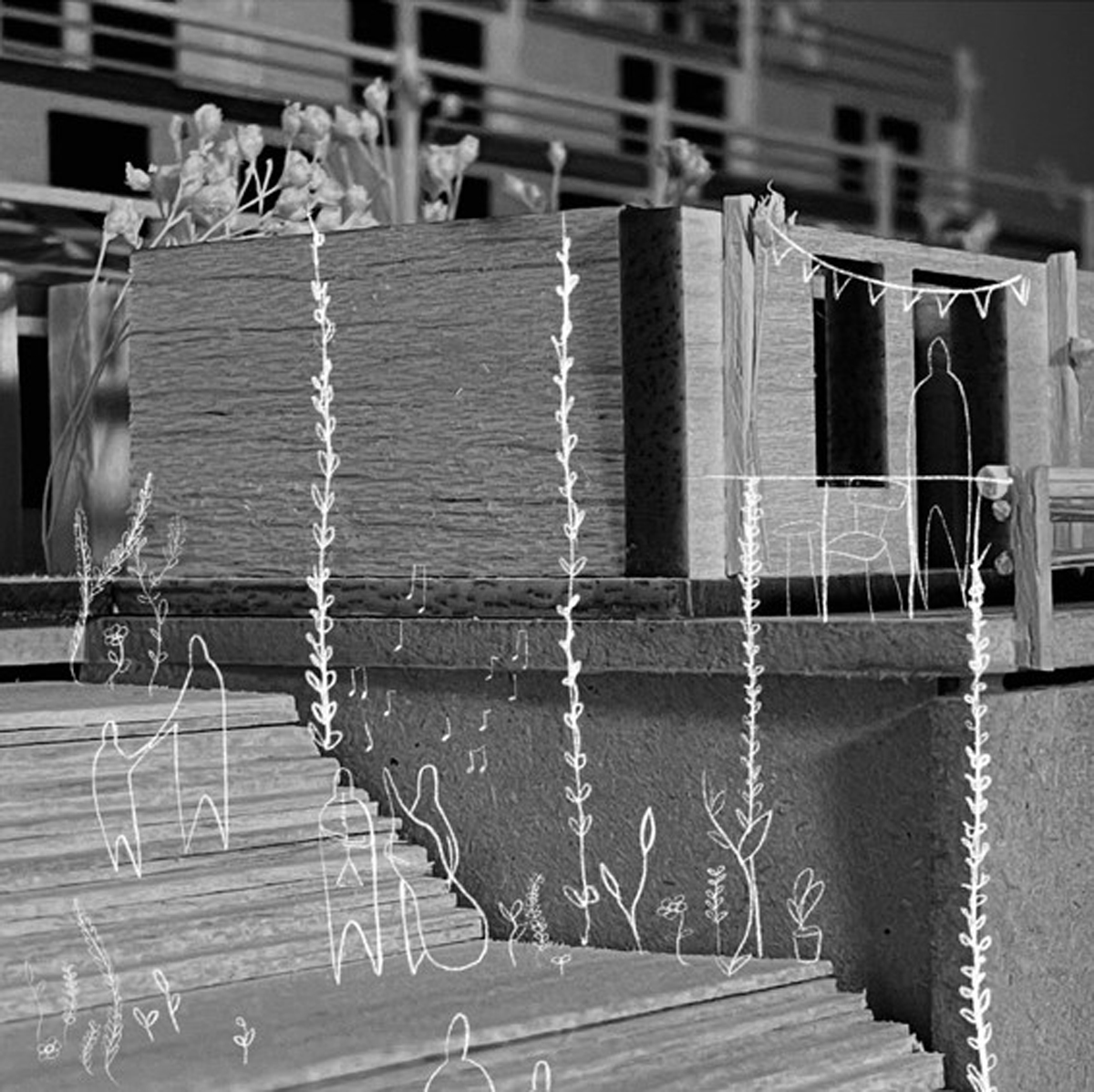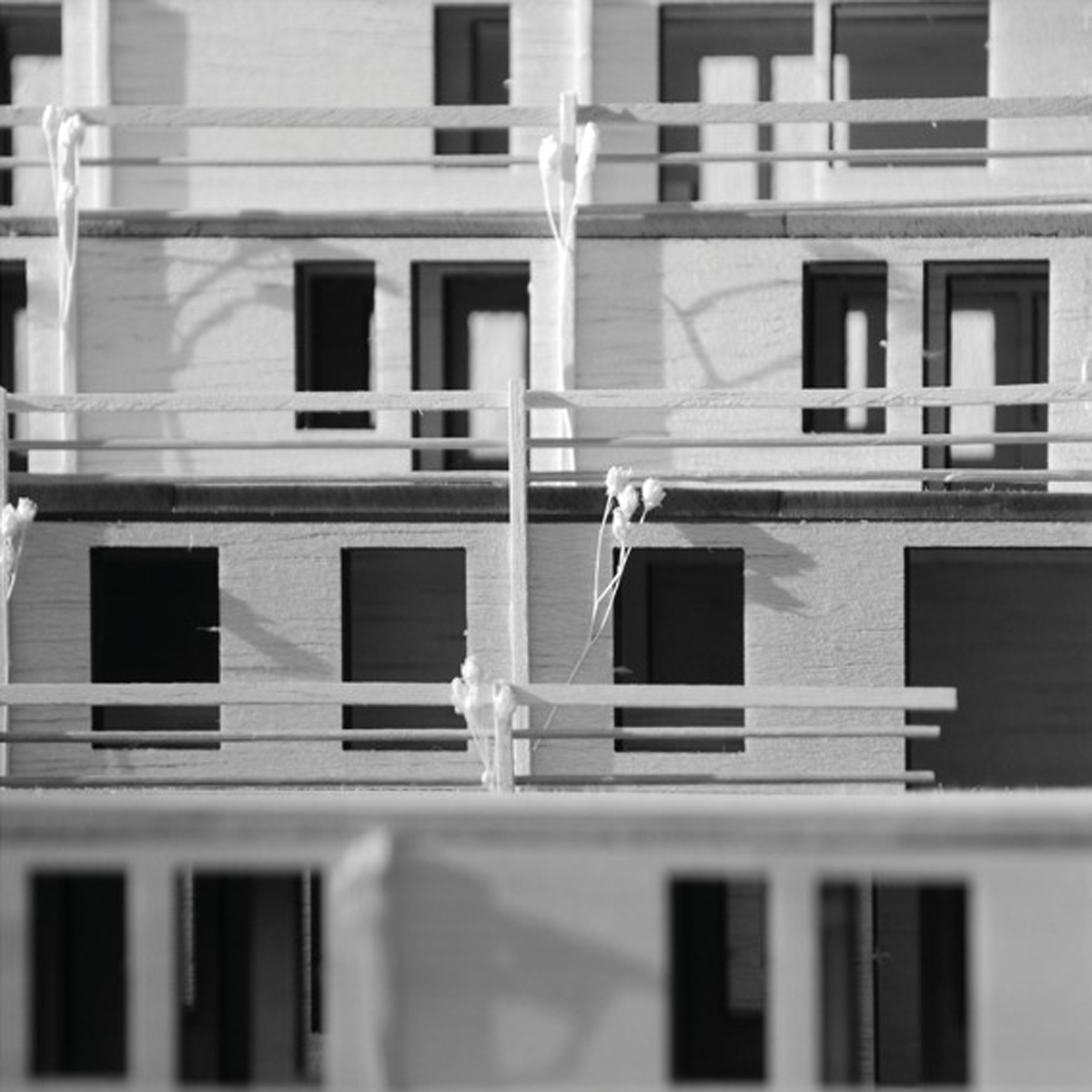 Paralelamente, el proyecto presenta una gran superficie de espacio compartido al aire libre, formalizado por la terraza, el patio y el pasaje. La terraza es uno de los grandes temas del proyecto. Un “accidente” generado como consecuencia del retroceso de módulos en cada nivel, con el fin de conseguir el edificio grada. Es en este momento, donde se genera el principal eje de conectividad entre estancias, pero también, el lugar que mejor responde a la idea de “co-living” -requerida en el ejercicio-. La terraza agrupa a todo el núcleo de vecinos y toma el carácter de la comunidad, generando así un espacio pictórico propio del grupo residente.